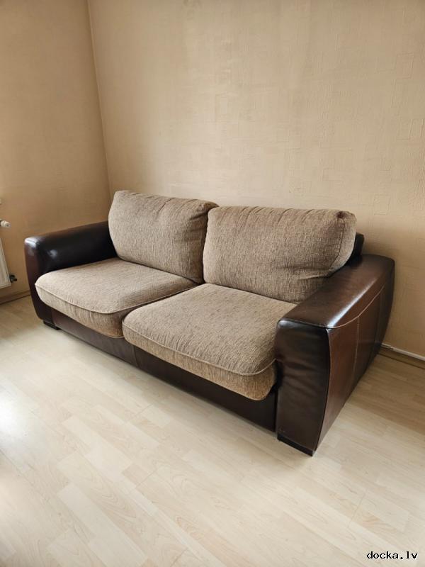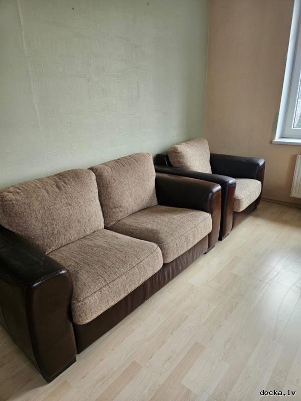 Подаются два мягких дивана и кресло. Подлокотники из коричневой кожи. Имеются потертотси. Дешево